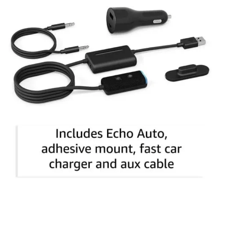 ¿Qué incluye en la caja?Echo Auto (2.ª generación) con micrófono y módulos de parlantes incluidos, cable enrollado, soporte adhesivo de montaje para vehículo, sticker adhesivo adicional, paño de limpieza, cable auxiliar de 3.5 mm y cargador de carga rápida.