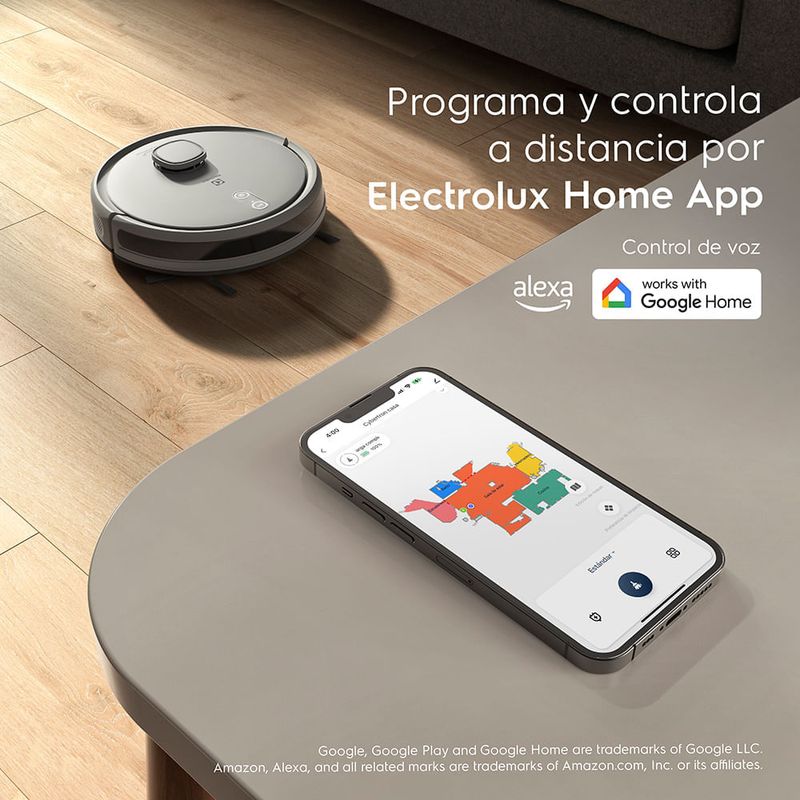 Equipada con conectividad Wi-Fi, puede controlarse fácilmente desde la app Electrolux Wellbeing, permitiendo programar horarios, seleccionar modos de limpieza y visualizar el mapa del hogar en tiempo real. Su base autolimpiante vacía el depósito automáticamente, ofreciendo mayor comodidad y autonomía.