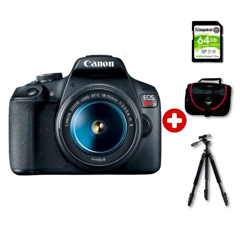 Este completo kit deluxe incluye el lente EF-S 18-55mm f/3.5-5.6 IS II, memoria Kingston de 64GB, estuche acolchado premium y trípode profesional Weifeng 6663A. La Canon EOS Rebel T7 es perfecta para quienes buscan rendimiento, portabilidad y resultados profesionales. ¡Lleva tu creatividad más lejos y captura cada historia con calidad Canon!
