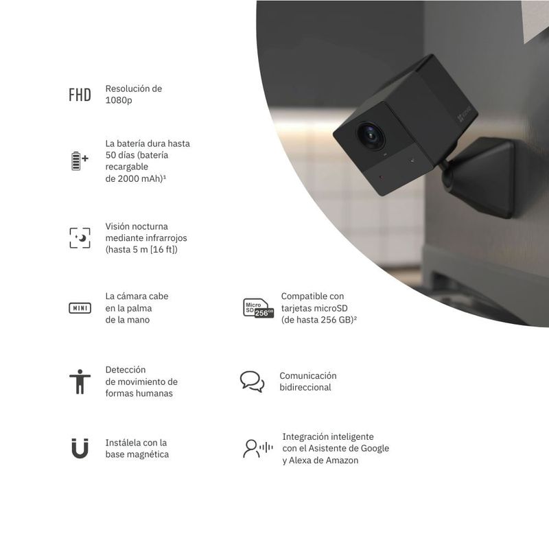 Gracias a su batería recargable de 2000 mAh, la EZVIZ CB2 puede funcionar hasta 50 días con una sola carga, garantizando vigilancia continua incluso sin tomacorrientes cercanos. Es ideal para interiores, viajes o espacios donde se requiere una solución flexible y sin complicaciones. Además, incorpora visión nocturna por infrarrojos de hasta 5 metros y detección inteligente de movimiento humano, reduciendo falsas alarmas y enviando notificaciones precisas a tu smartphone.