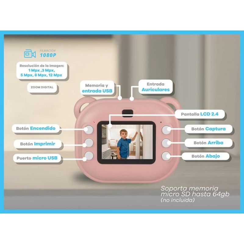 La cámara digital con impresión instantánea rosada es el regalo perfecto para que las niñas desarrollen su creatividad mientras se divierten. Su diseño moderno y fácil de usar les permite capturar fotos y verlas impresas en papel térmico en solo 3 segundos. Ideal para pequeñas fotógrafas que adoran registrar cada momento y conservarlo como recuerdo tangible.