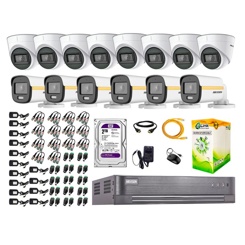 El kit de cámaras de seguridad Hikvision incluye 14 cámaras y un disco duro de 2TB, ofreciendo grabación Full HD y amplio almacenamiento para monitoreo continuo. Ideal para hogares, oficinas y negocios que requieren vigilancia completa y confiable.
