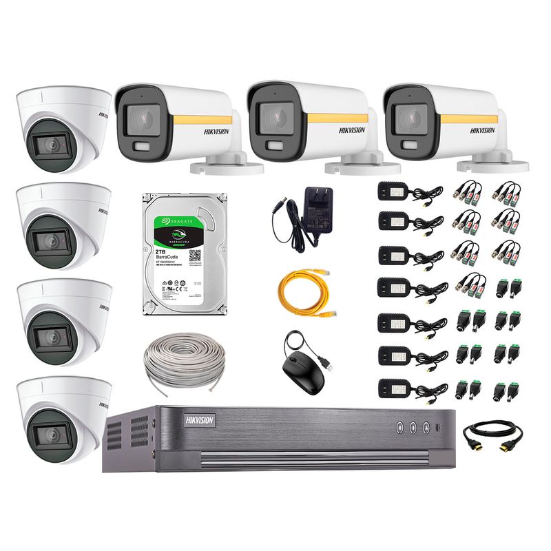 El kit de cámaras de seguridad Hikvision incluye 7 cámaras y un disco duro de 2TB, ofreciendo grabación Full HD y almacenamiento amplio para monitoreo continuo. Ideal para hogares, oficinas y negocios que requieren vigilancia completa y confiable.