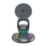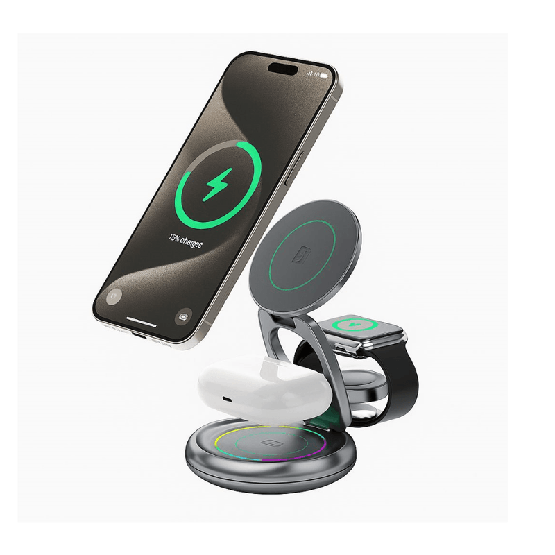 Este cargador inalámbrico 3 en 1 combina practicidad, estilo y eficiencia para que puedas cargar tu iPhone/Android con Qi, Apple Watch y AirPods al mismo tiempo, sin cables ni desorden. Su sistema magnético requiere MagSafe o un case compatible para asegurar una alineación precisa y estable.
