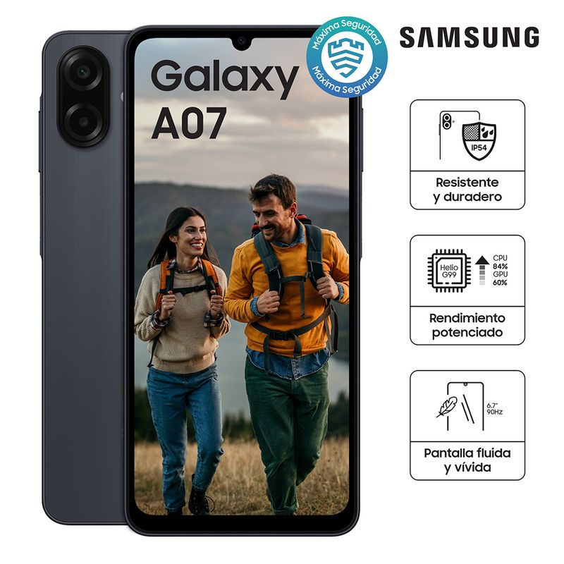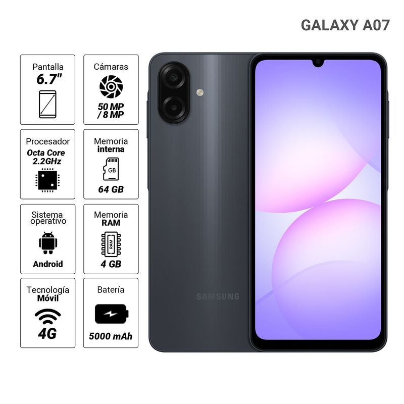 Rendimiento eficiente para tu día a día: El Samsung Galaxy A07 combina 4GB de RAM y 64GB de almacenamiento, brindando fluidez para aplicaciones, navegación y multitarea básica.