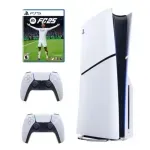 La PS5 Slim con lector de discos incluye puertos USB, salida HDMI y compatibilidad con aplicaciones de streaming para ver películas, series y escuchar música. El paquete trae el videojuego EA Sports FC 25, base para la consola, cable de alimentación, cable HDMI, cable USB y manuales.