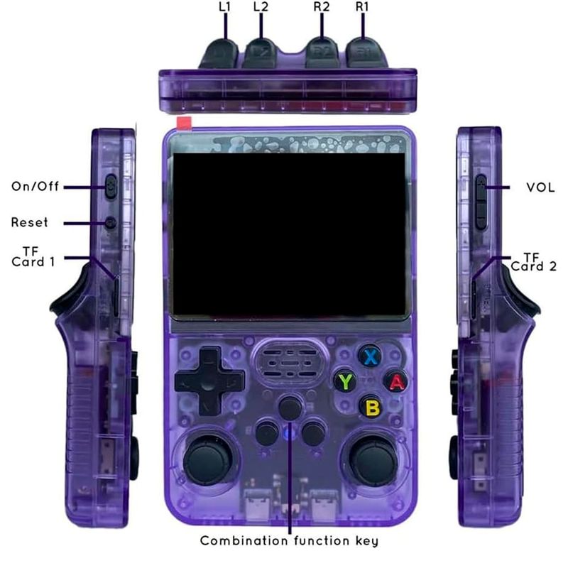 La consola portátil retro R36S violeta te transporta a la época dorada de los videojuegos con miles de títulos clásicos en un dispositivo compacto. Su pantalla HD y diseño ergonómico garantizan una experiencia de juego cómoda, clara y envolvente.