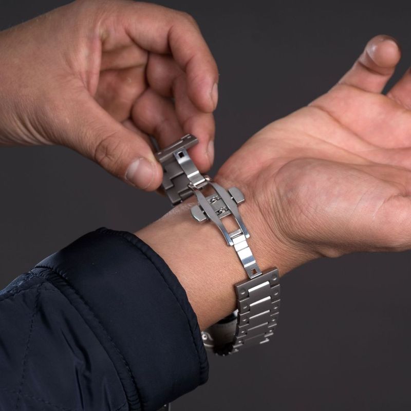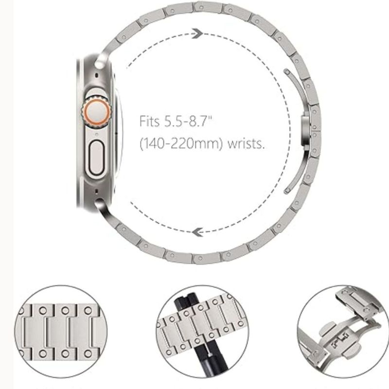 La correa de titanio Double Point para Apple Watch combina estilo y resistencia, con diseño moderno y doble punto que asegura un ajuste cómodo y seguro para tu reloj.