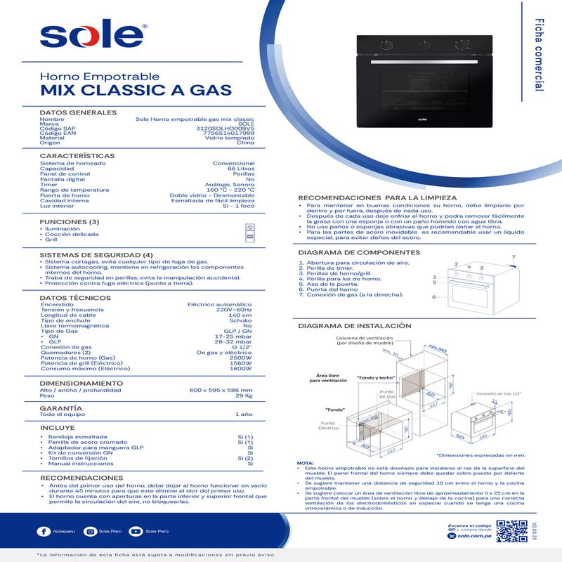 El Horno Empotrable Sole Mix Classic 66L a gas está diseñado para quienes buscan eficiencia, seguridad y estilo en su cocina. Su sistema de horneado convencional garantiza una cocción uniforme, mientras que el panel de control con perillas y el timer análogo permiten un manejo práctico y preciso.