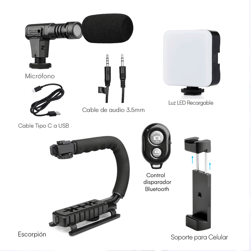 El Kit de Grabación Escorpión KREED AY-49U es una solución práctica y completa para quienes buscan mejorar la calidad de sus grabaciones con cámaras o celulares. Fabricado en material ABS negro, ofrece una estructura resistente y ligera que permite sujetar el dispositivo de manera estable y cómoda en orientación horizontal. Es ideal para realizar grabaciones, transmisiones y capturas en movimiento, brindando mayor control durante el uso.