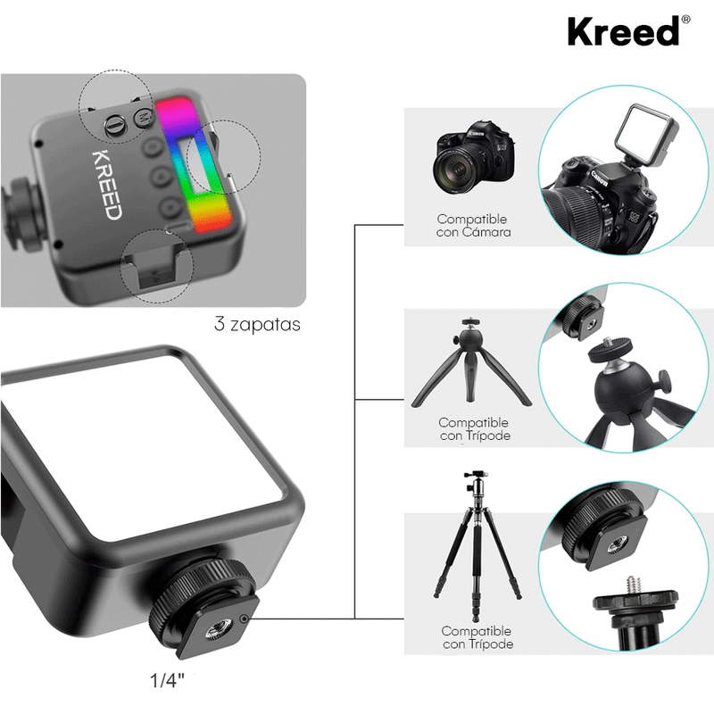 Ligera y versátil, la luz LED KREED MJ88 está diseñada para brindar iluminación profesional en fotografía y video. Ofrece una temperatura de color ajustable entre 3000K y 7000K, ideal para crear ambientes cálidos o fríos según la escena. Además, incorpora efectos RGB multicolor que permiten añadir creatividad y estilo a tus producciones.