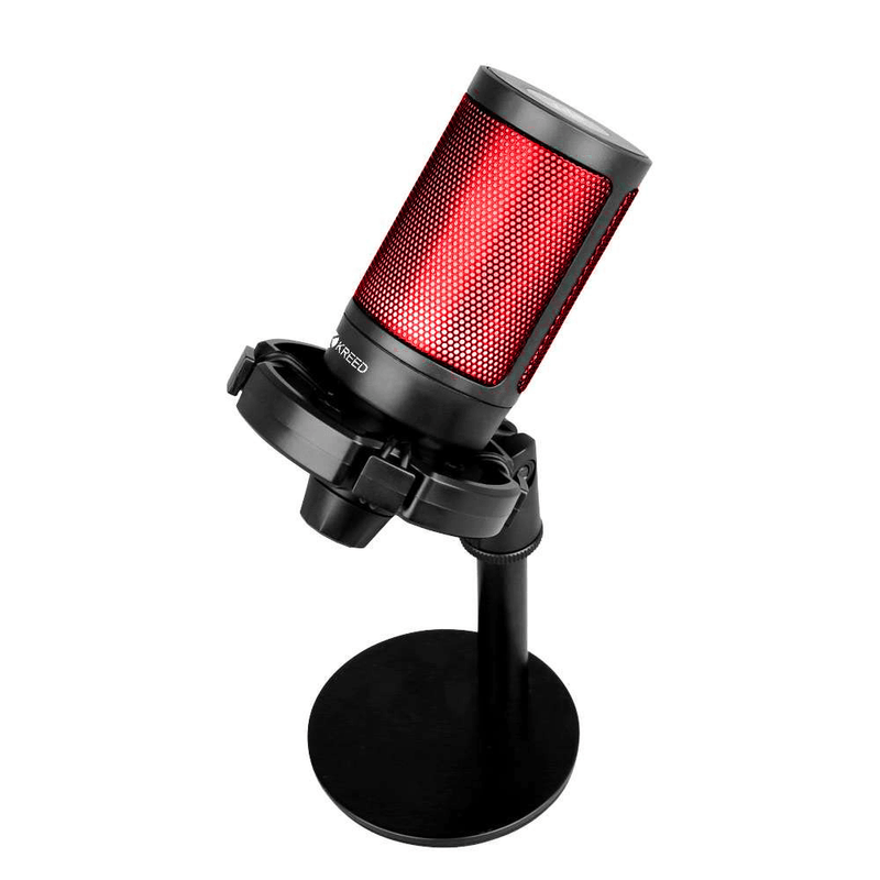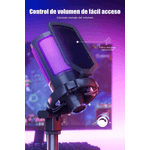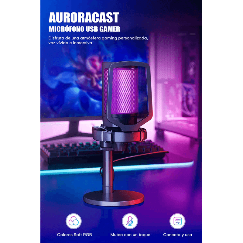 El AuroraCast integra controles prácticos: botón táctil para silenciar, opción de cambiar modos de luz RGB y perilla para ajustar el volumen en tiempo real. Incluye soporte de mesa estable y filtro antipop para eliminar sonidos indeseados, garantizando una grabación más limpia y profesional.