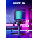 Con un diseño moderno e iluminación RGB suave de 7 colores, este micrófono añade estilo a tu setup y permite personalizar la atmósfera de cada sesión. La conexión USB plug & play lo hace compatible con Windows, Mac, PlayStation y teléfonos mediante adaptador, sin necesidad de configuraciones complicadas.