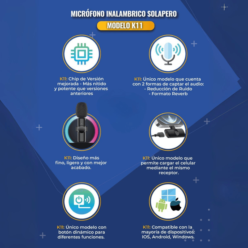 Compacto, ligero y fácil de usar, el K11 se conecta rápidamente mediante su receptor tipo C, ofreciendo compatibilidad con una amplia gama de dispositivos modernos. Su funcionamiento estable, buena autonomía y alta calidad de captura lo convierten en un accesorio esencial para quienes buscan mejorar sus grabaciones sin equipos complejos.