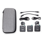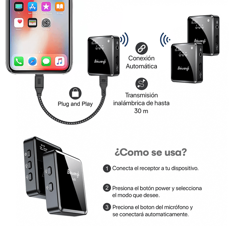 Este modelo incluye dos micrófonos que pueden usarse simultáneamente, ofreciendo versatilidad para entrevistas o grabaciones en pareja. Su batería recargable integrada brinda hasta 8 horas de uso continuo y permite una distancia de transmisión de hasta 20 metros. Además, cuenta con tres modos de sonido —acústico, reducción de ruido y reverb— que se adaptan a diferentes entornos y estilos de grabación.