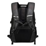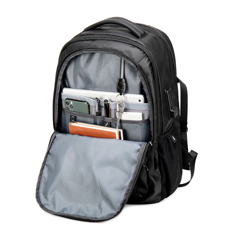 Fabricada en poliéster impermeable y resistente a rasguños, la mochila protege tus dispositivos y objetos personales. Cuenta con compartimento acolchado para laptops de hasta 16”, compartimento principal de gran capacidad con doble cremallera, compartimento delantero con bolsillos para billetera, celular, lapiceros y iPad, además de bolsillos laterales para botella o sombrilla y un bolsillo posterior oculto. Incluye porta llaves desmontable y agujero para audífonos, asegurando comodidad y practicidad en cada uso.