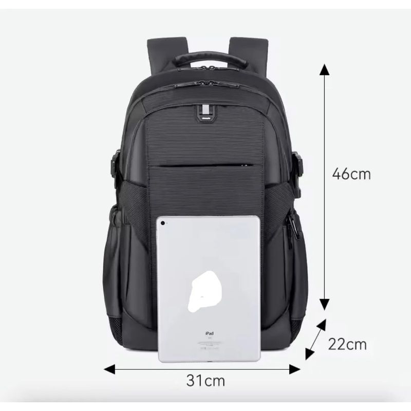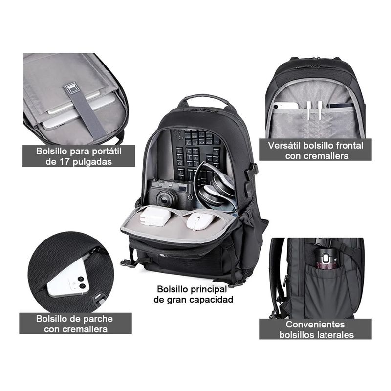 La mochila impermeable multiuso en color negro es la compañera ideal para viajes, oficina o estudio. Diseñada con las medidas de cabina de avión, te permite llevarla fácilmente en tus desplazamientos sin preocuparte por el espacio. Su tela resistente al agua mantiene tus pertenencias seguras y secas, incluso en condiciones de lluvia, brindando confianza en todo momento.