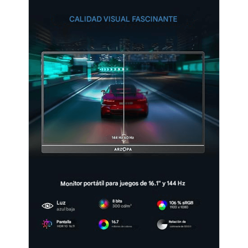 Gracias a su diseño delgado, liviano y fácil de transportar, puedes llevarlo a cualquier lugar y conectarlo rápidamente mediante puertos HDMI o USB-C a tu laptop, consola o smartphone. El Arzopa Z1FC es el monitor gamer portátil perfecto para quienes buscan rendimiento, movilidad y calidad visual en un solo dispositivo.