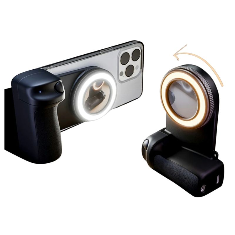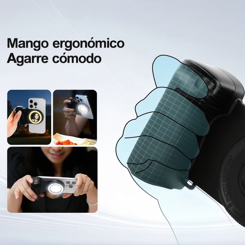 Convierte tu celular en una cámara profesional con el Grip con Obturador y Luz Magnética para Celular. Este accesorio ergonómico te permite tomar fotos y grabar videos más estables gracias a su diseño tipo cámara, que reduce el temblor de la mano. Ideal para creadores de contenido, vendedores online y viajeros, este grip integra un botón de disparo para que puedas tomar fotos sin necesidad de tocar la pantalla de tu celular, mejorando la comodidad y precisión en cada toma.