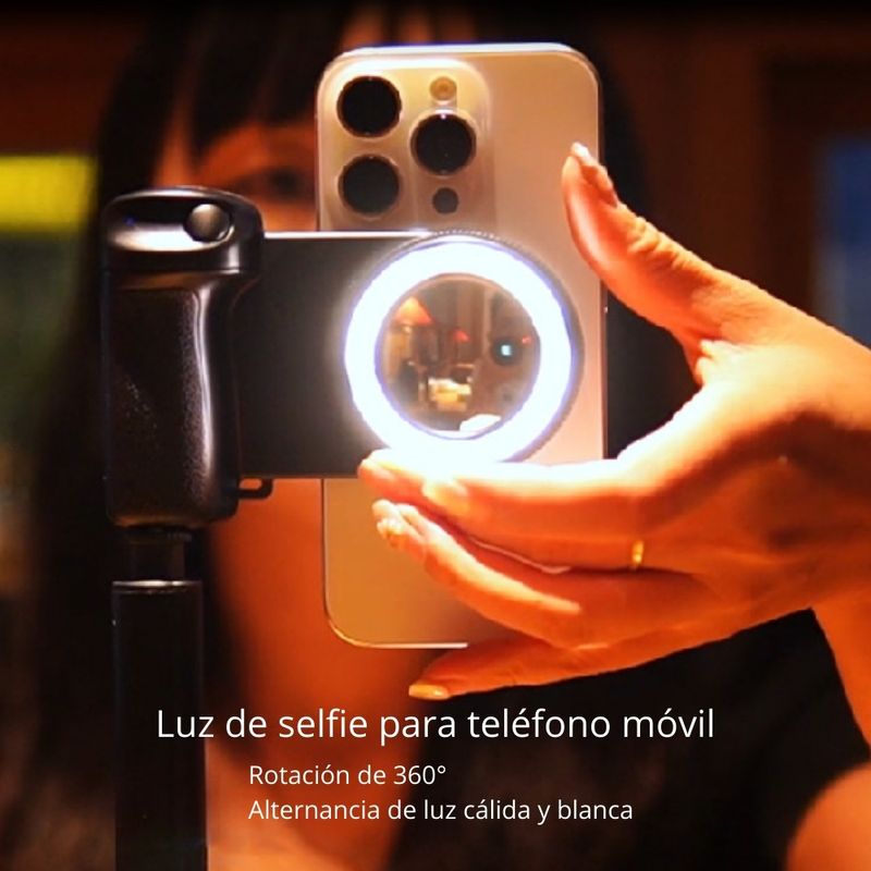 La luz de relleno magnética incorporada suaviza las sombras y mejora la calidad de tus selfies, reels, lives y fotos en general, especialmente en condiciones de baja luz o contraluz. La luz tiene niveles de brillo ajustables, con opciones de luz blanca y cálida, lo que te permite adaptarla a diferentes situaciones de grabación. Además, el montaje magnético rápido (MagSafe) facilita el acople y desacople al instante, y si tu equipo no es compatible con MagSafe, solo necesitarás un aro metálico adhesivo (no incluido) para usarlo.