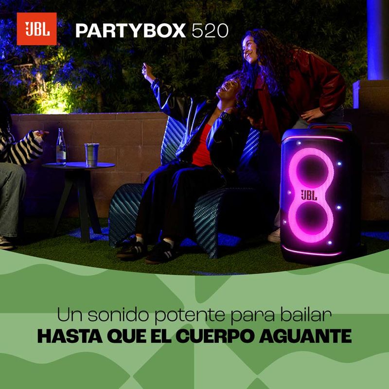 El parlante de torre Bluetooth JBL PartyBox 520 negro ofrece un sonido potente de 400W que convierte cualquier reunión en una fiesta inolvidable. Diseñado con la tecnología JBL Original Pro Sound, garantiza graves profundos, agudos nítidos y un audio de calidad profesional en todo momento. Su diseño vertical y elegante lo hace destacar, mientras que la iluminación dinámica integrada aporta un espectáculo visual que se sincroniza con la música.