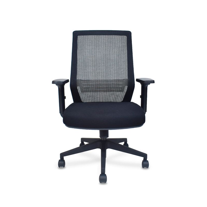 Componentes ajustables y estructura de alto rendimiento Cuenta con respaldo en malla para mayor ventilación, apoyo lumbar en polipropileno regulable 1D, y brazos también ajustables con PAD del mismo material. El asiento con espuma inyectada, tapizado textil y base de plastic seat mejora el confort y la durabilidad. Su mecanismo Syncro con perilla de tensión y bloqueo se adapta a tus movimientos, y la base de nylon con ruedas de 50 mm (nylon o PU) facilita el desplazamiento.