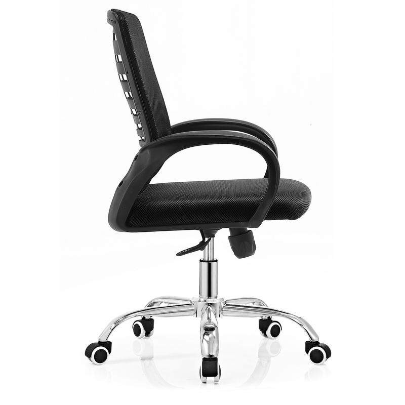 Dispone de un mecanismo basculante que permite reclinarse suavemente para mayor comodidad y brazos fijos que proporcionan estabilidad adicional. Su base cromada aporta resistencia y un toque elegante, con ruedas que garantizan movilidad fluida y silenciosa en diferentes superficies.