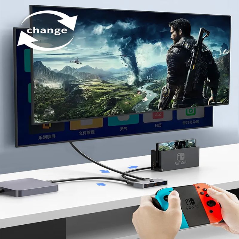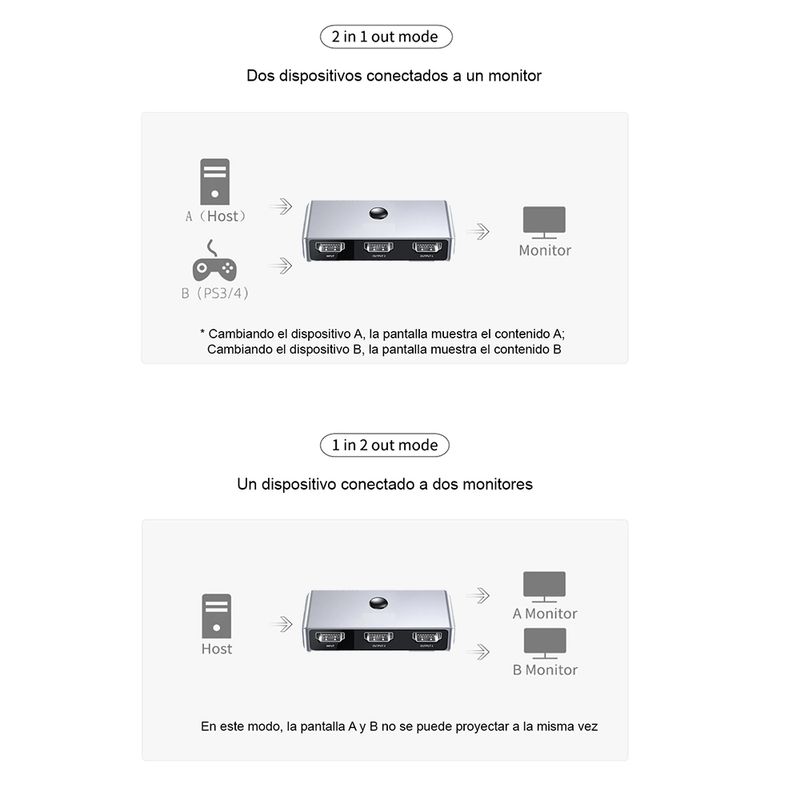 Con este Switcher Selector de HDMI de alta resolución 4K bidireccional podrás usar 2 entradas para una salida HDMI, o 1 entrada para 2 salidas HDMI, contiene un botón switcher para cambiar de dispositivo hdmi, con este adaptador se puede elegir el contenido de 2 dispositivos en una TV o monitor, pero no proyectar en 2 pantallas a la misma vez.