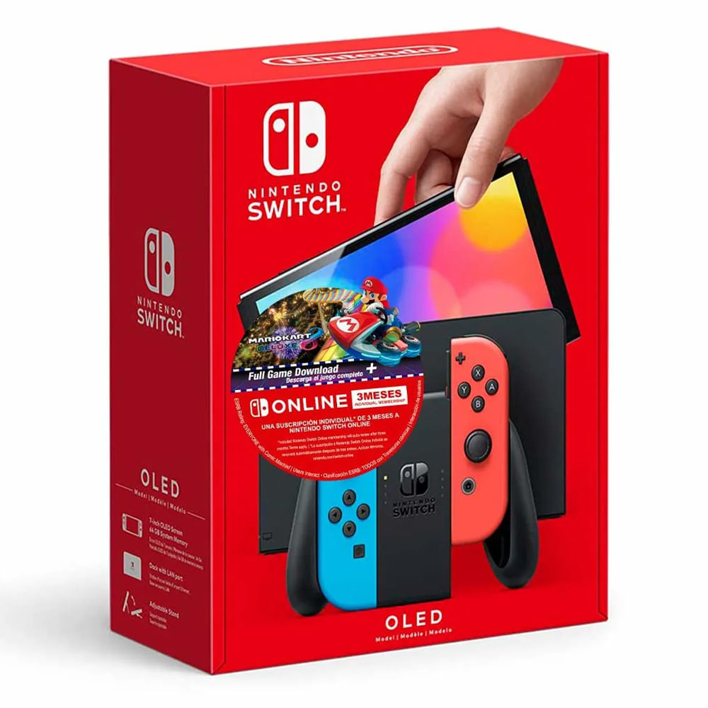 Consola Nintendo Switch Oled 64GB, rojo y azul neón + Juego Mario Kart 8 + 3 meses de suscripción