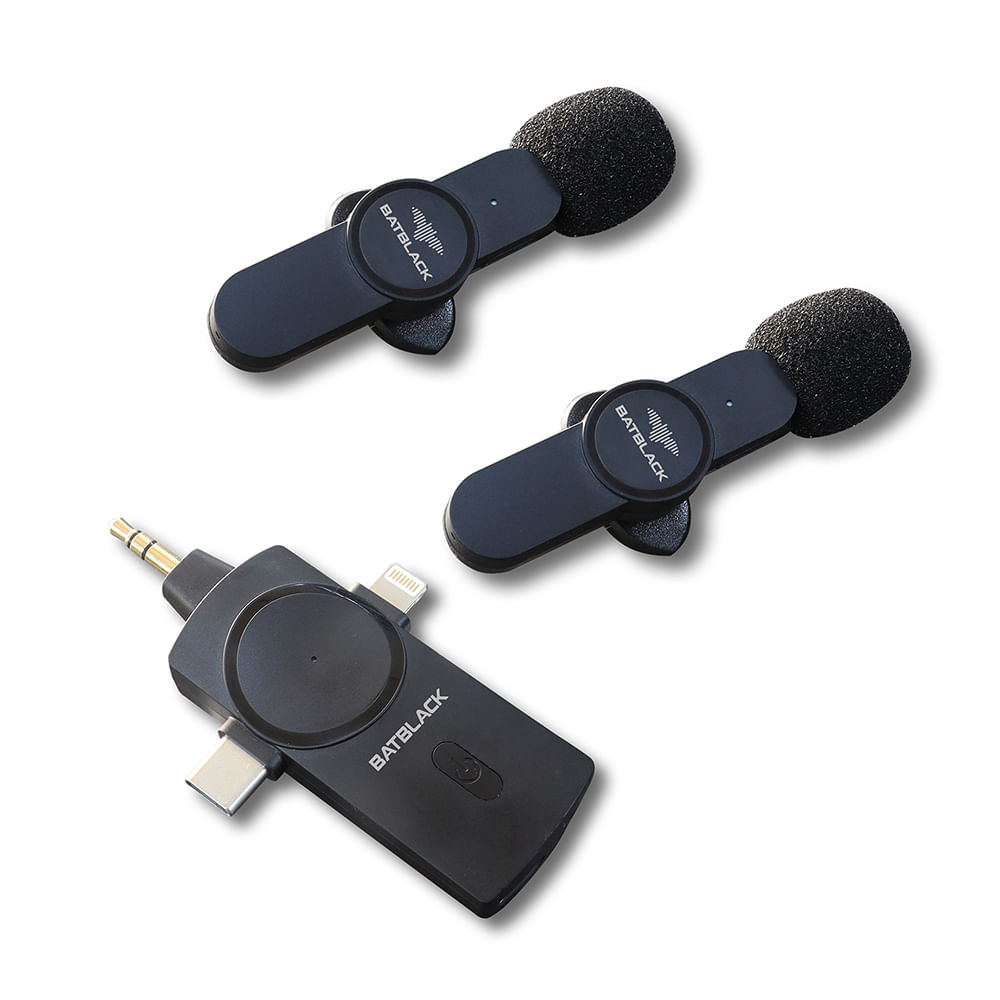 Micrófono Inalámbrico Lavalier BatBlack, 2 Micrófonos, Estuche Recargable, Conectores Tipo C/Lightning/3.5mm, negro