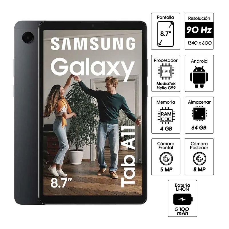 La batería de 5100 mAh proporciona autonomía suficiente para acompañarte durante toda la jornada. Con un acabado moderno en color gris, la Galaxy Tab A11 combina portabilidad, rendimiento y estilo, siendo una excelente opción para estudiantes, familias y usuarios que buscan un dispositivo versátil.