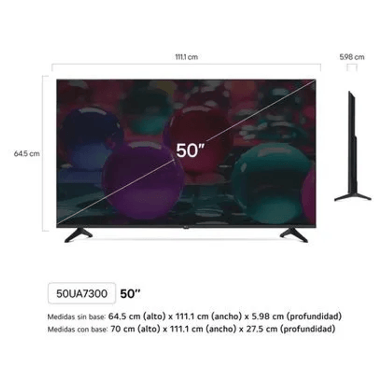 El LG 50UA7300PSB destaca también por su conectividad completa, con Wi-Fi, Bluetooth, tres puertos HDMI, dos puertos USB y entrada Ethernet. Su sintonizador digital incluido permite ver canales en alta calidad, mientras que su diseño moderno lo convierte en una excelente opción para cine en casa, videojuegos o deportes. Con dimensiones pensadas para facilitar la instalación, ofrece una experiencia audiovisual inmersiva y equilibrada que se adapta a diferentes tipos de usuario.