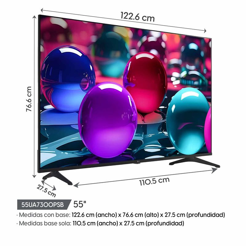 El televisor LG 55UA7300PSB de 55 pulgadas ofrece una experiencia visual 4K UHD optimizada con inteligencia artificial, ideal para quienes buscan un equilibrio entre potencia, diseño y conectividad. Su procesador α7 AI Gen8 mejora automáticamente el brillo, el contraste y los colores de cada escena, ofreciendo imágenes vibrantes, precisas y realistas. Perfecto para disfrutar de películas, series o videojuegos con una calidad superior desde la comodidad de tu hogar.