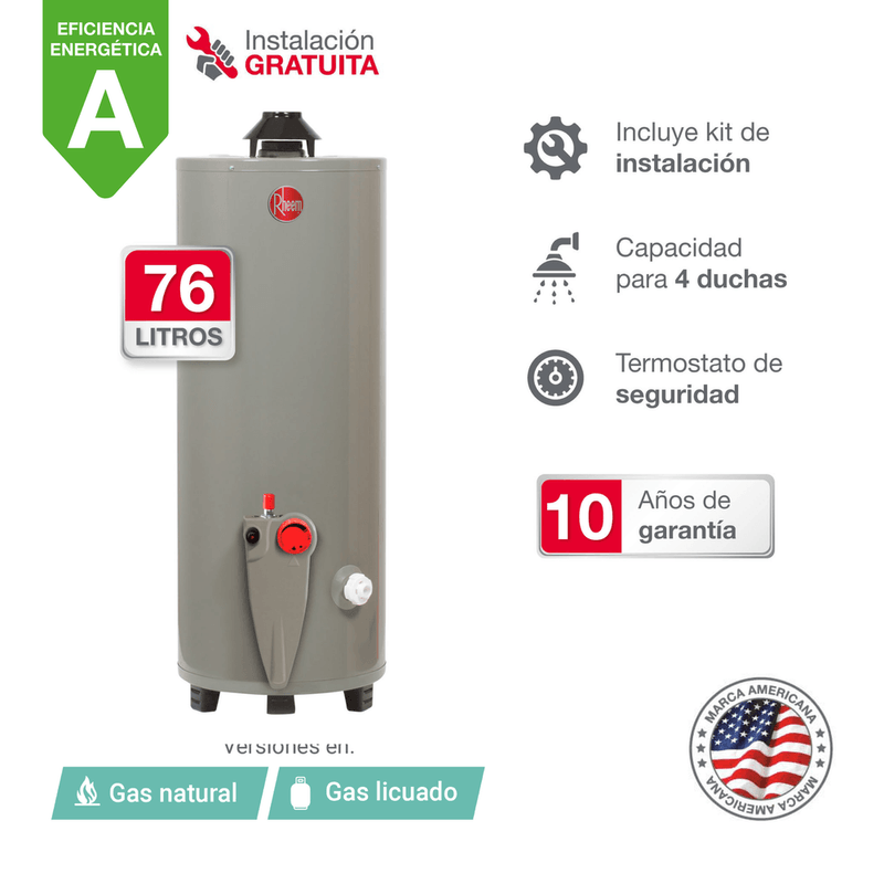 Instalación gratuita y garantía de calidad Compra el Termotanque a Gas tipo A Rheem en Coolbox.pe y aprovecha la instalación gratuita. ¡Disfruta de agua caliente de calidad y eficiencia!